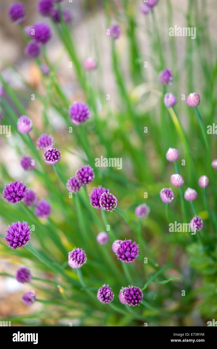 Chives Allium Schoenoprasum Purple Flowers On Long Green Stems Of Stock Photo Alamy